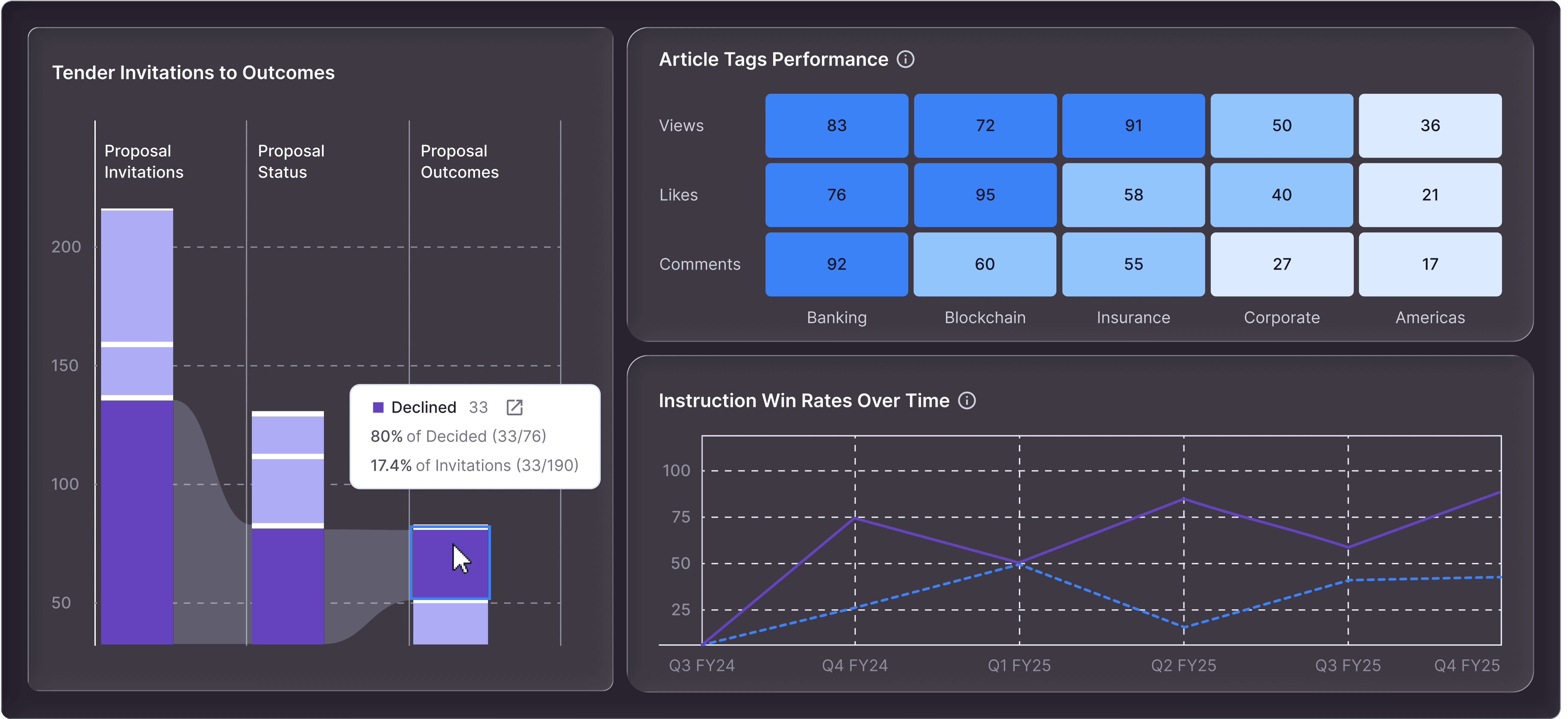 Gain insights into why you win work, how your knowledge and secondments perform, and which content drives client engagement—so you can refine your strategy and strengthen relationships.