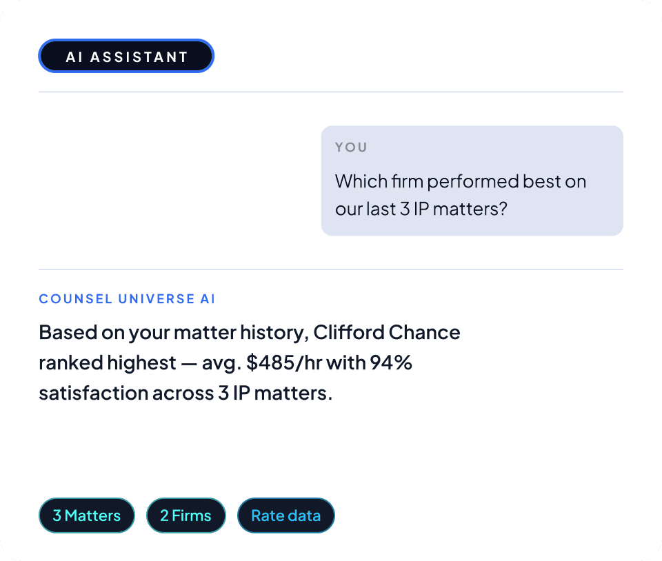 Think of it as a universal connector — like a plug adapter for AI. Counsel Universe links ChatGPT, Copilot, or Claude directly to your firms, matters, and spend data. No new login. No tab switching. Just answers.
