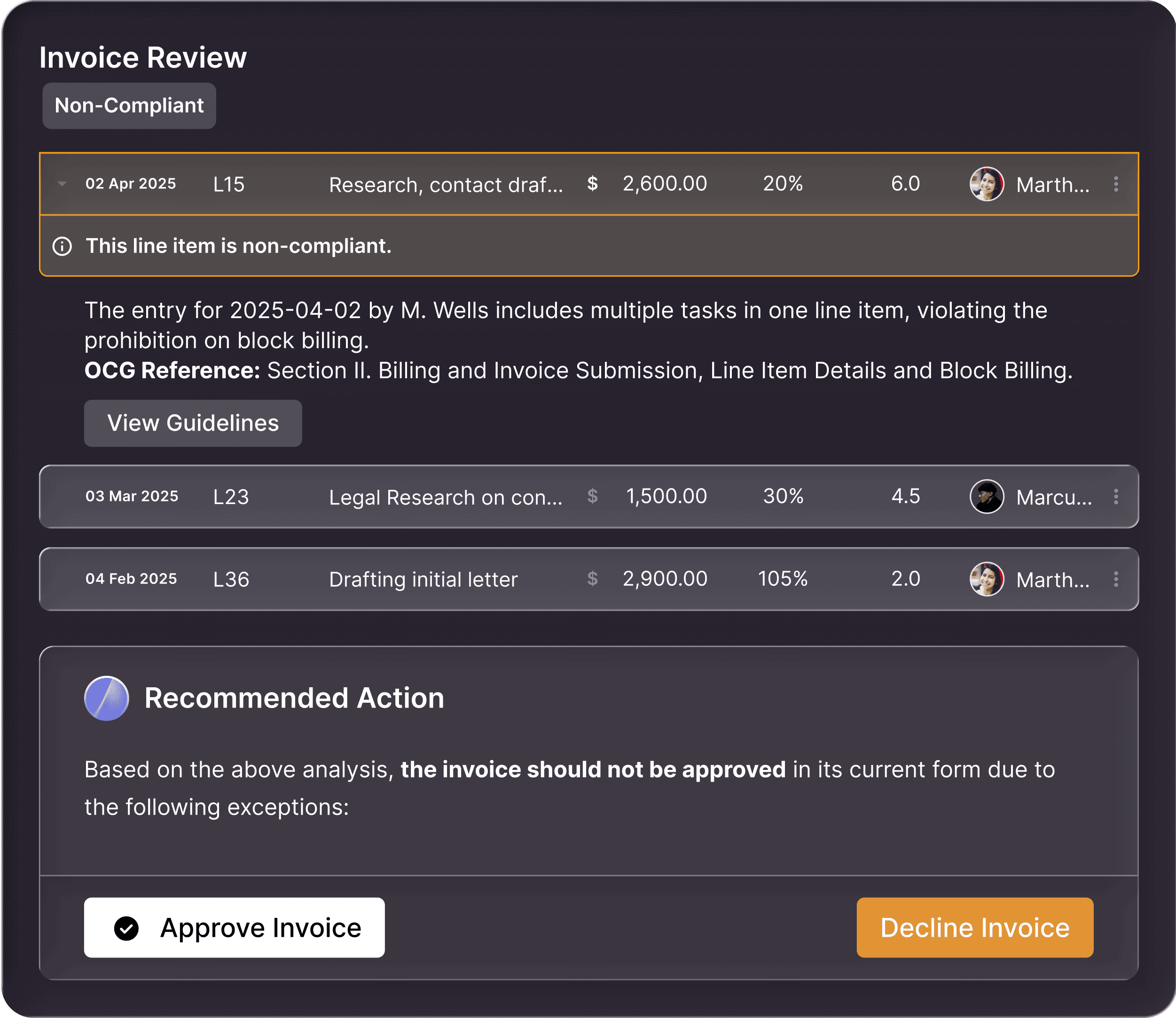 Streamline financial management with AI tools, automating invoice reviews, tracking scope changes at the deliverable level against your agreed to scope of work, to reduce surprises and improve cost management across matters.