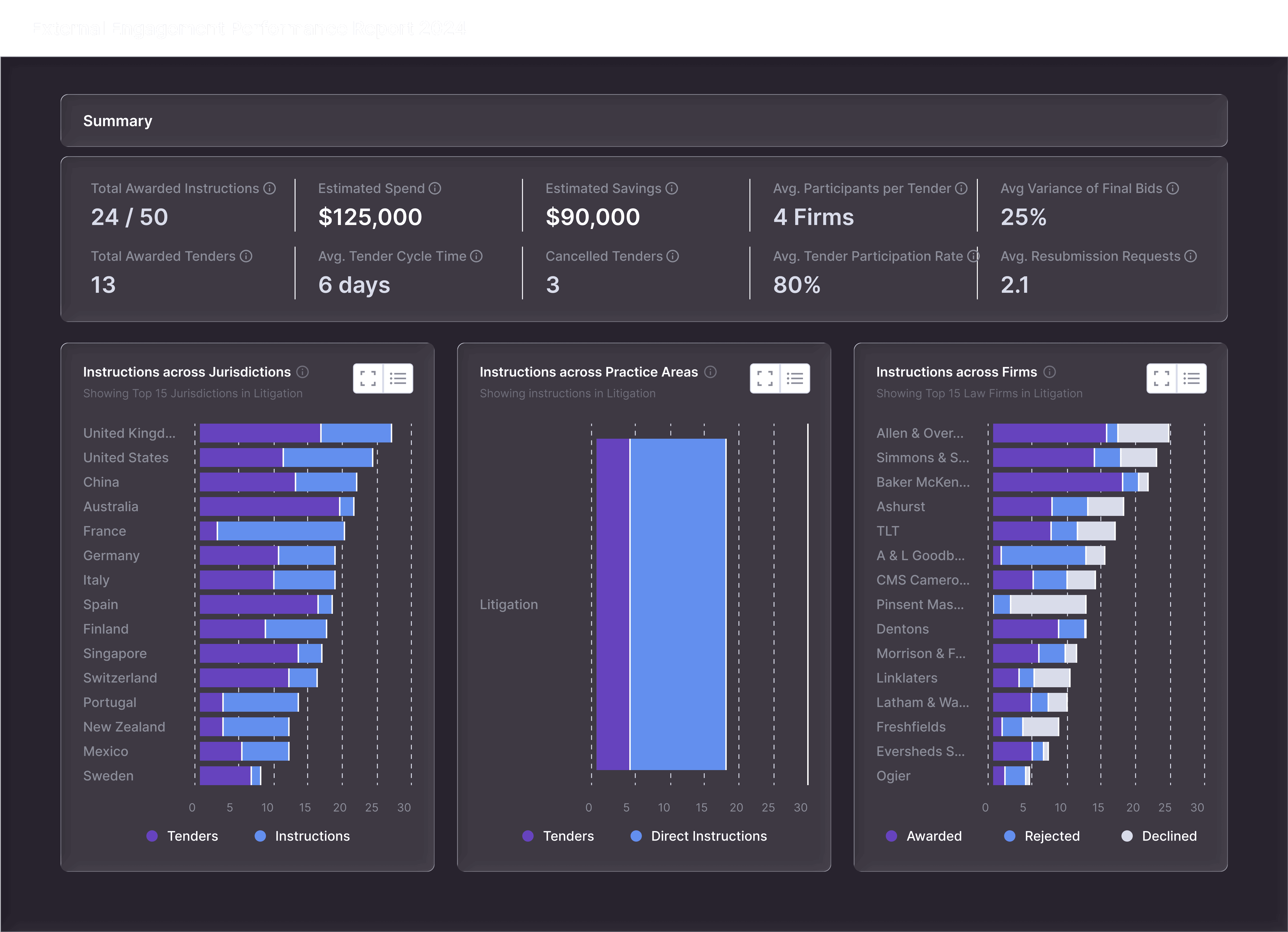 Understand what work is flowing through your department and how internal teams and law firms are being deployed across practice areas and jurisdictions to support better planning, resourcing, and performance tracking.