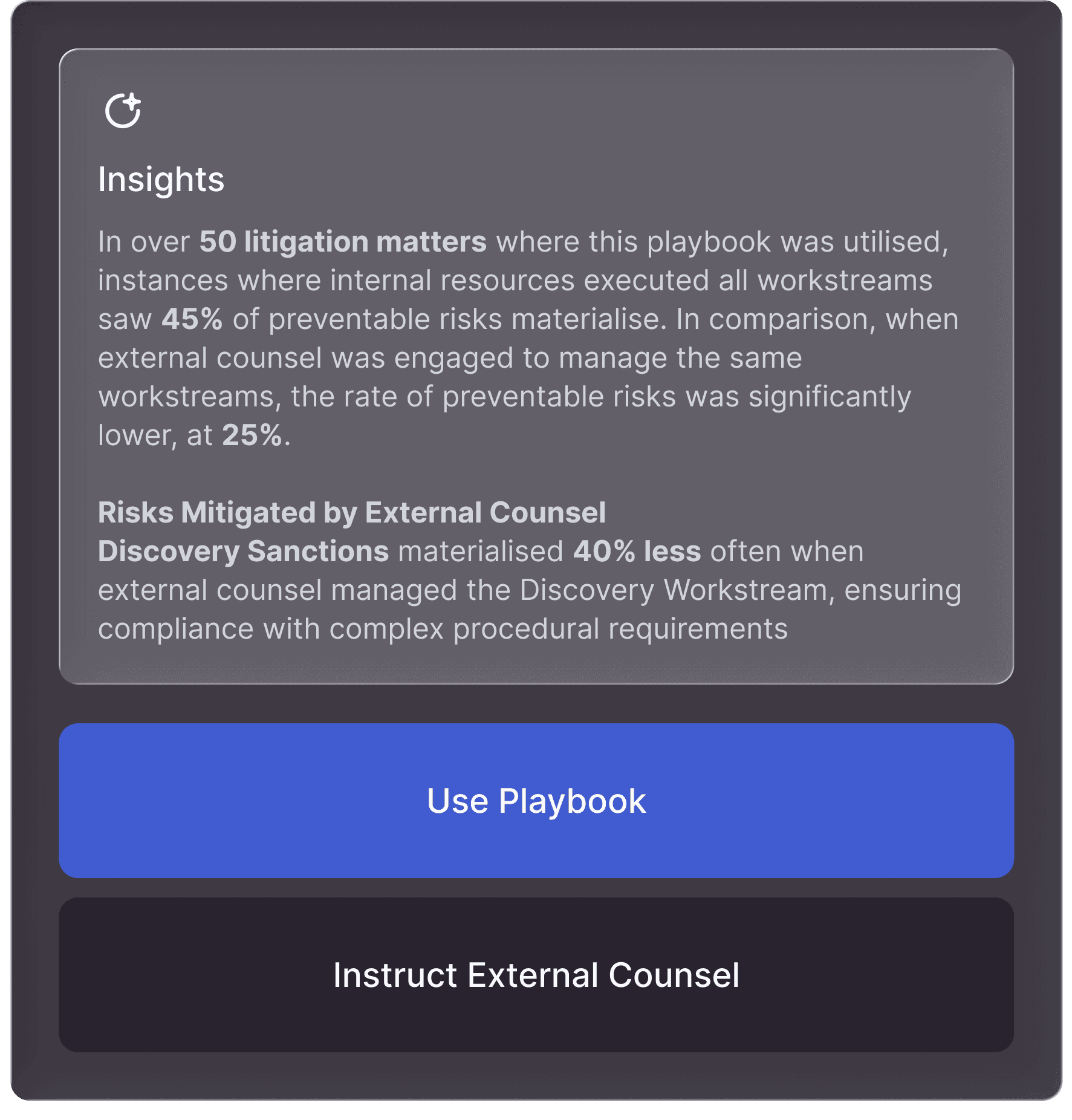Use best-practice playbooks to easily visualize the execution of various matters, while AI insights help evaluate the risks and rewards of handling work in-house versus engaging external support.