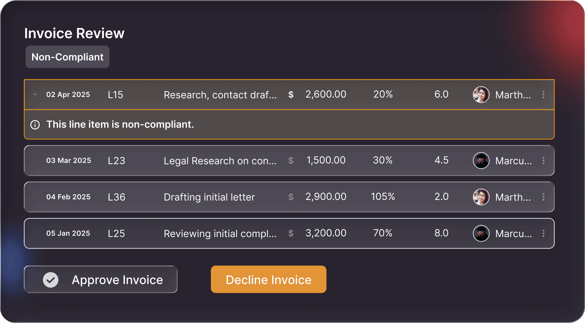 Automatically check invoices against outside counsel billing guidelines and flag non-compliant billing items.